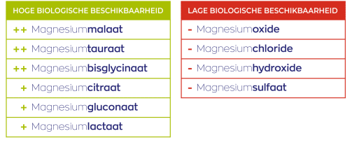 Magnesiumtauraat, -bisglycinaat en -malaat zijn zogenoemde organische magnesiumvormen die het lichaam relatief goed opneemt. Anorganische gebonden magnesium, zoals magnesiumoxide en magnesiumchloride zijn vormen met een lage biologische beschikbaarheid, waardoor het lichaam niet instaat is om het mineraal goed op te nemen.